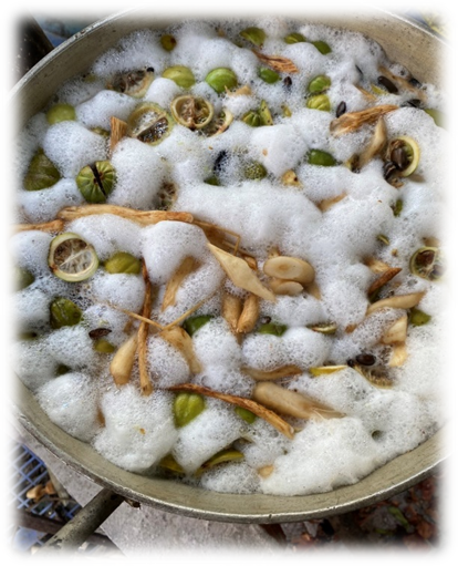 Lần 1: Chúng em sử  dụng 1kg bách bộ, 0,5 kg quả găng, 100g lá cây xương cay, 200g hạt na, 1kg vỏ bòng, 0,5kg hạt bòng. Tuy nhiên, số lượng hỗn hợp thu lại được không nhiều và dầu gội không có độ sánh, khi gội không có nhiều bọt.