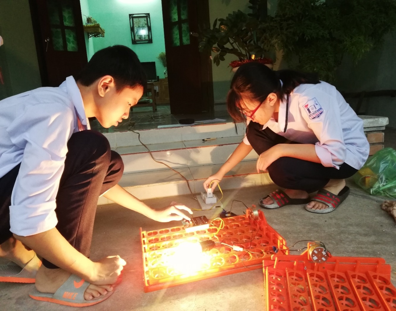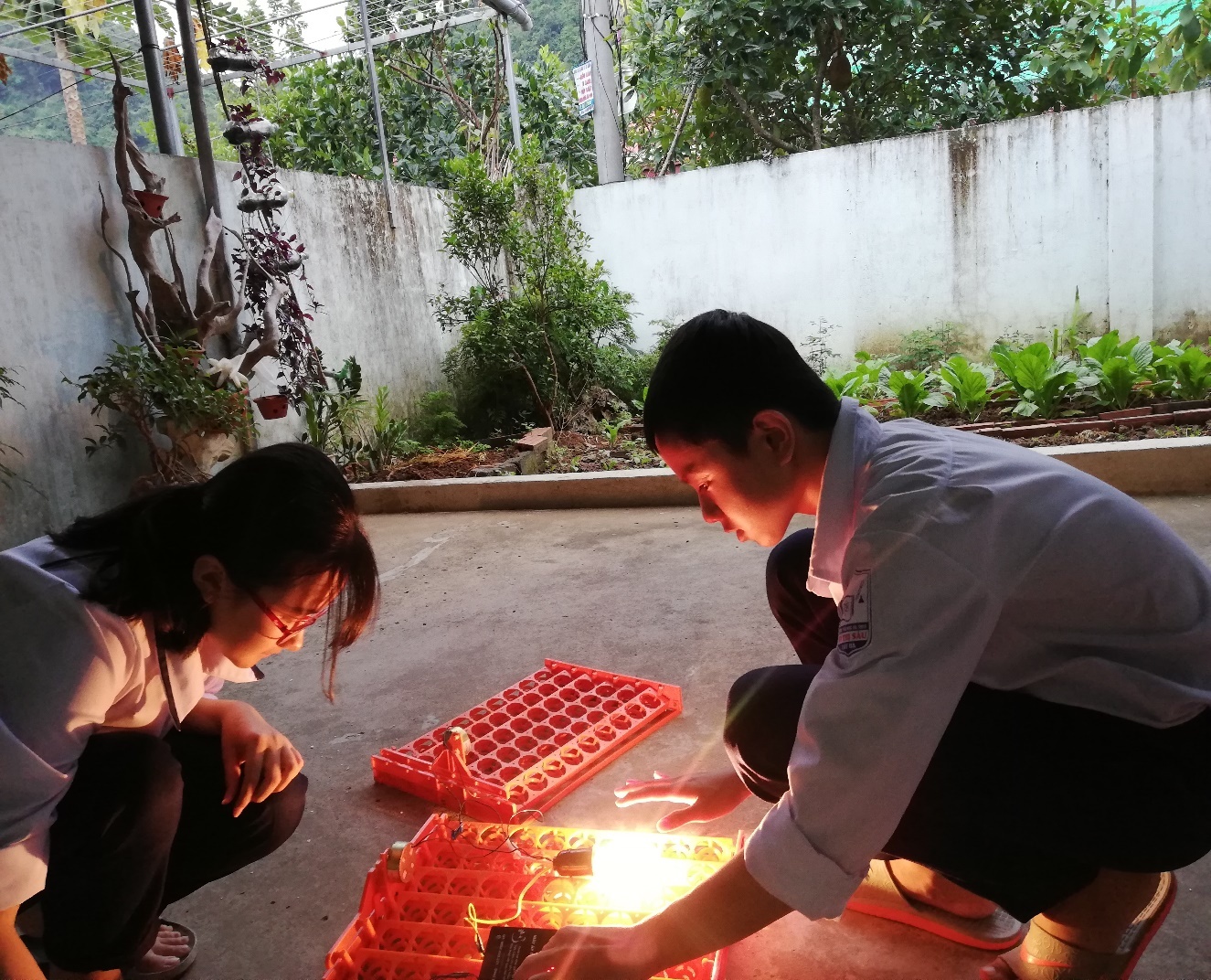 Qua nghiên cứu, tìm tòi, học hỏi, lắp đặt thành công, chúng em tiến hành thử nghiệm thì thấy trứng xếp vào hai khay được 100 quả, nhiệt độ ổn định, quạt gió chạy đều, giá trứng được đảo đều, trứng nóng đều.Chúng em đang tiến hành ấp trứng và được 10 ngày và khoảng 10 ngày nữa thị trứng sẽ nở thành gà con.